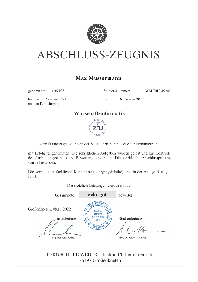 Entsprechend des Ergebnisses der Abschlussprüfung und unter Berücksichtigung der Hausaufgaben-Noten wird Ihnen dann das Fachlehrgangszeugnis der Fernschule Weber erteilt, das als Leistungs- und Fortbildungsnachweis dient.
